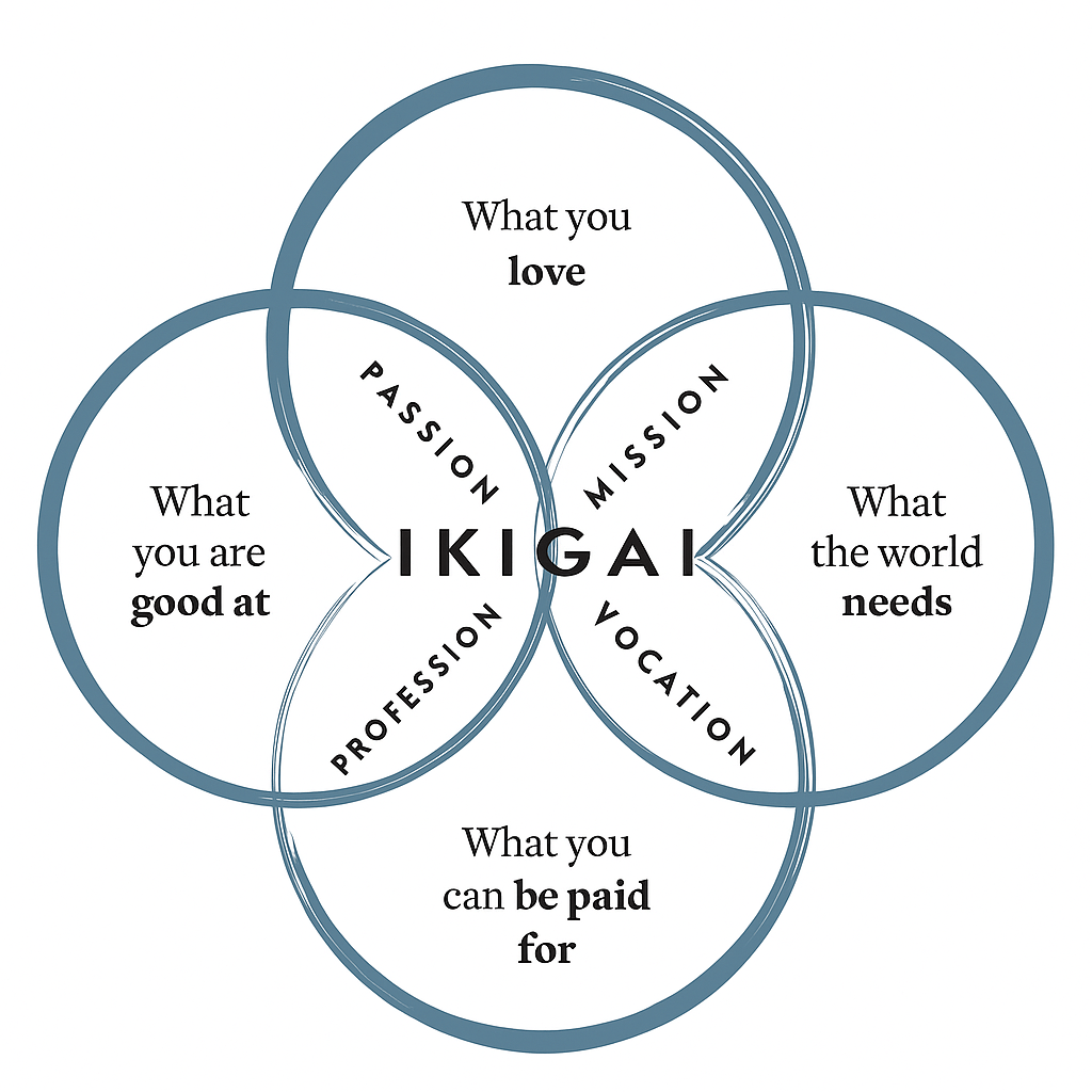 That’s where the Japanese concept of Ikigai comes in. It’s one of my favorite ideas to revisit. Ikigai is often described as the intersection of what you love, what the world needs, what you can be paid for, and what you’re good at. But beyond the diagram, it’s about discovering that sweet spot of purpose — where your passion meets action, and your work feels like flow.