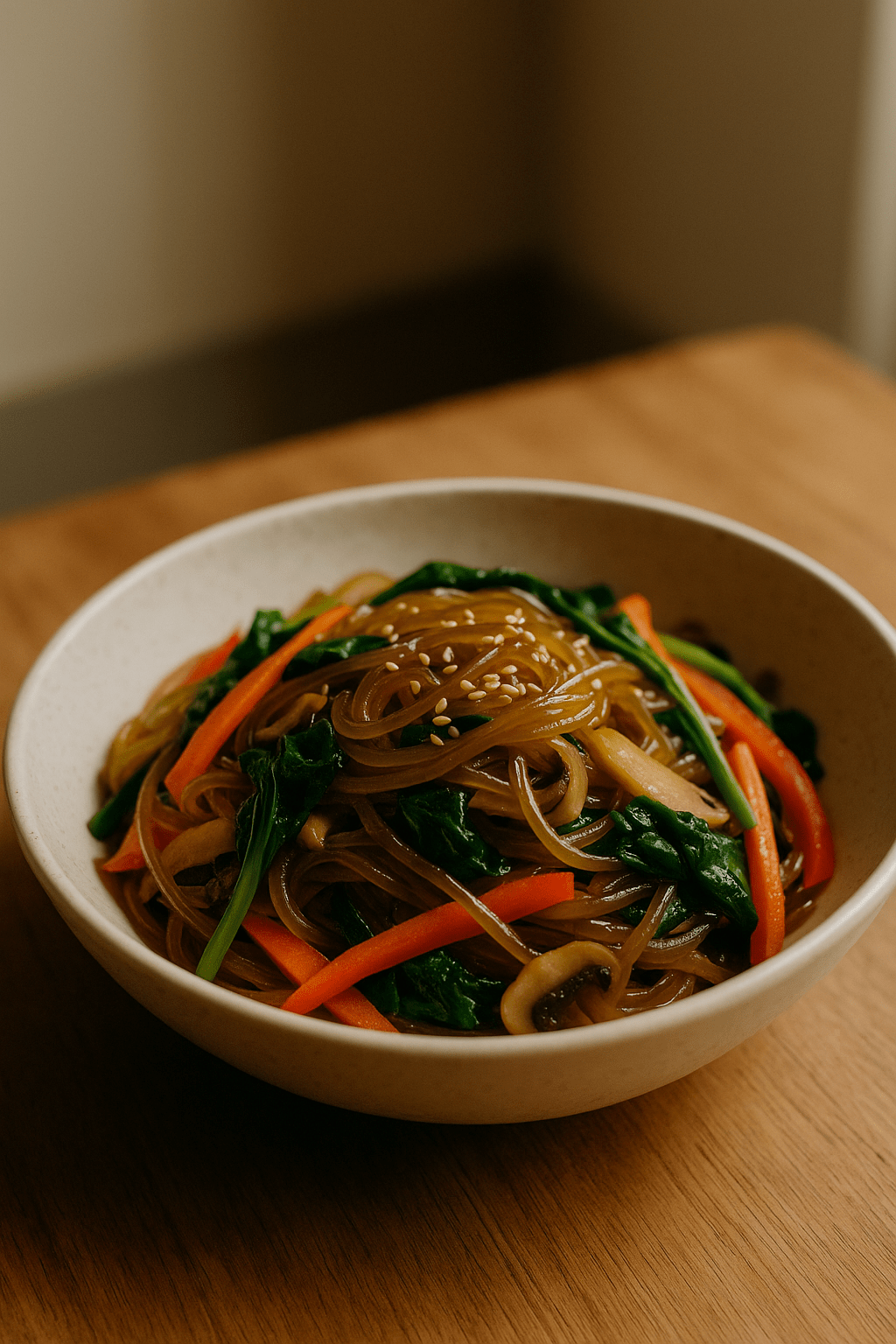 It arrived simple and unassuming, but the first bite told a different story. Sweet glass noodles, silky and light, glistened from a quick stir-fry in toasted sesame oil. Tossed with a generous mix of vibrant vegetables — julienned carrots, bell peppers, mushrooms, and spinach — it was a bowl of color, texture, and quiet harmony.