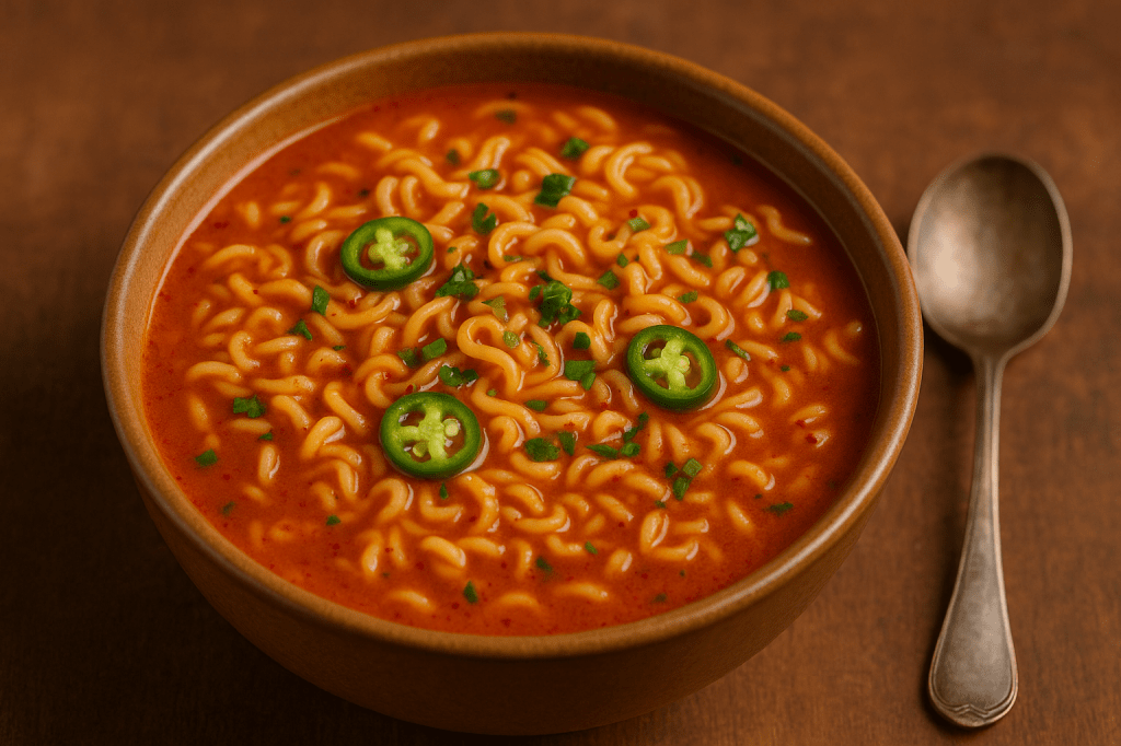 Not the fancy version. Not loaded with toppings or twisted into some gourmet noodle bowl. Just hot, soupy, spicy Maggi — the kind that fogs up your glasses and warms your soul. The kind you can make half-asleep, with one hand, while listening to old songs playing in the background.